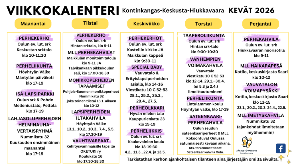 Kevään 2026 kerhokalenterit on julkaistu! Valmiit kalenterit löydät Perheille-osiosta. Mukavia kerhohetkiä!